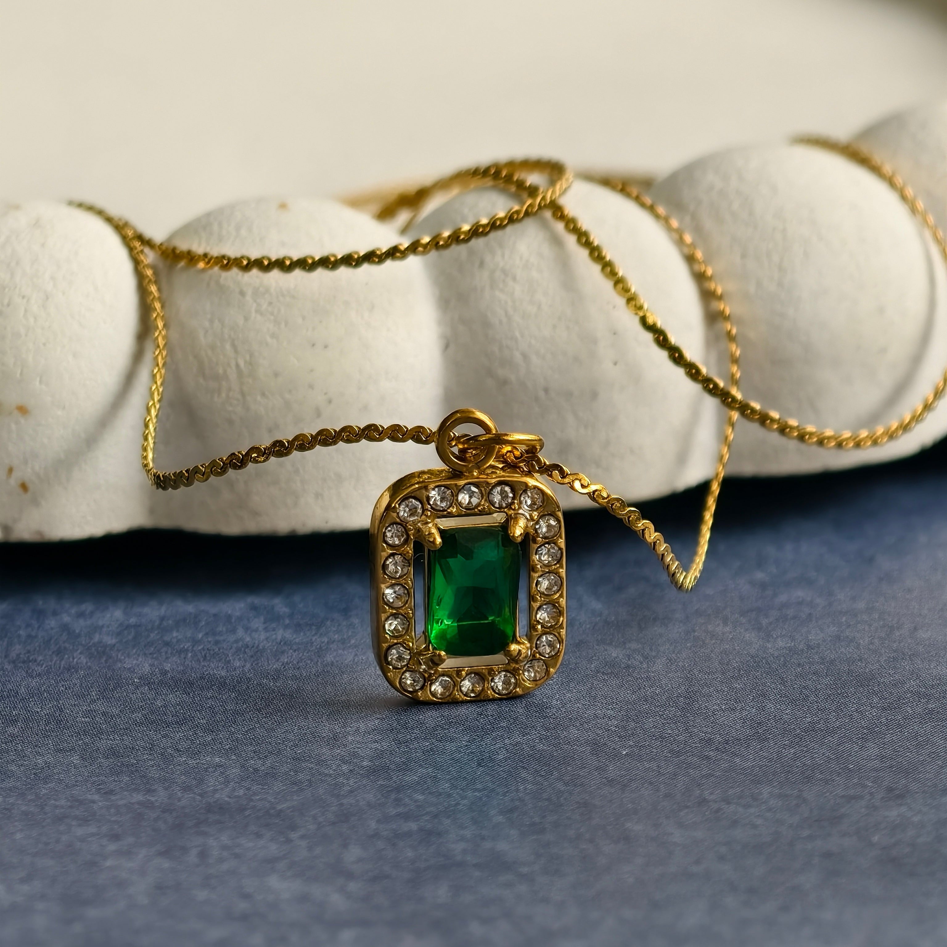 Regular price Rs. 999.00Sale price Rs. 999.00 Regular price Rs. 1,299.00Unit price / perBring a touch of French-inspired elegance to your everyday look with the Emerald Halo Solitaire Necklace. A vivid emerald‑green zircon sits at the center of a...