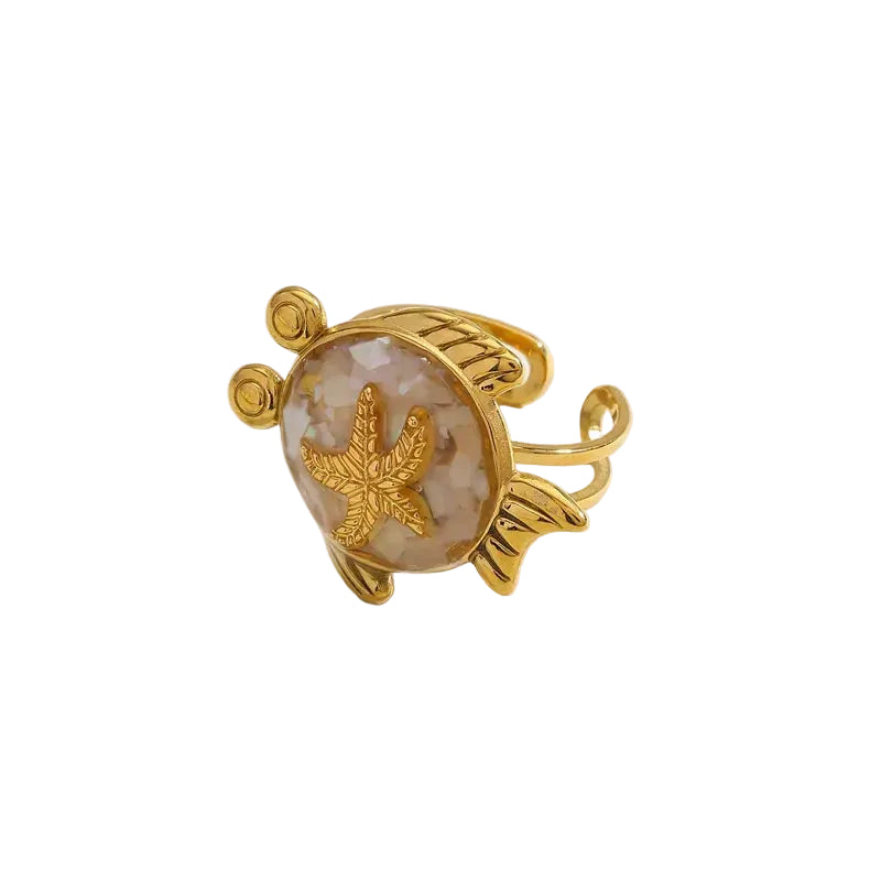 Capture festival waves with the Aria Opal Starfish Ring, a romantic open ring that glows like an iridescent sea treasure. A golden starfish sprawls across an...