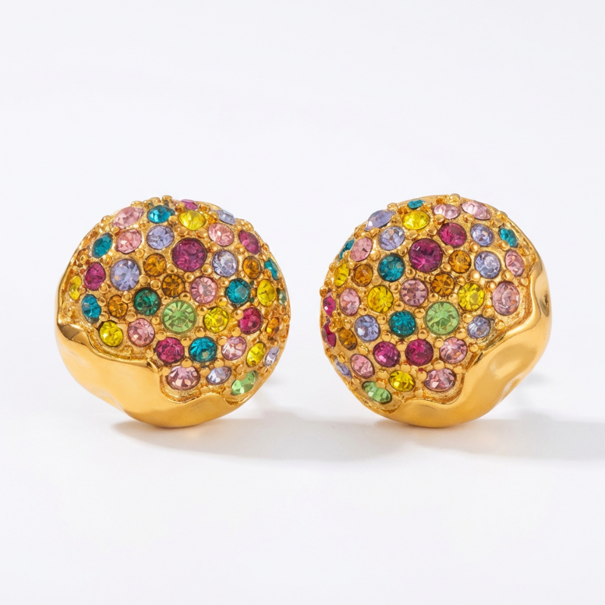 Drizzle IG glamour with the Isla Drip Studs, French‑style earrings that look like molten gold poured over rainbow candy. Oversized round domes drip with multicolored rhinestones...